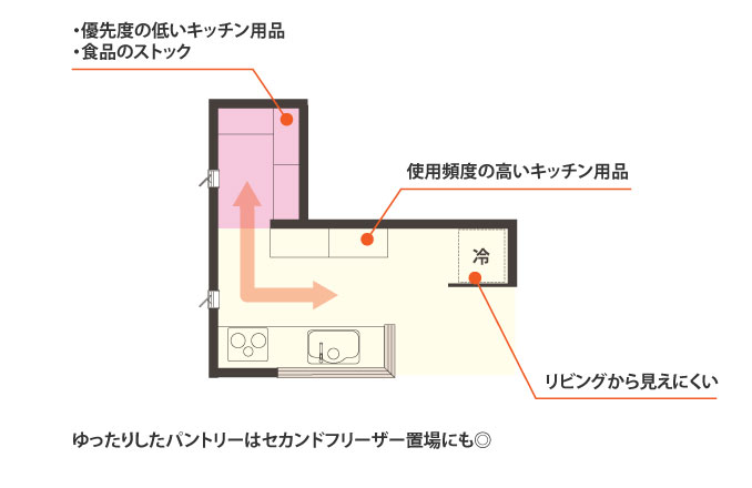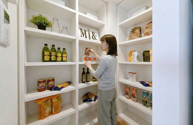 「あれ?どこだっけ?」の探す手間、高所や重ね置きで「取り出しにくい」キッチンでありがちなシーンからさようならしましょう。パントリー(食品庫)の実用性を実際にキッチンに立って体感してみましょう。